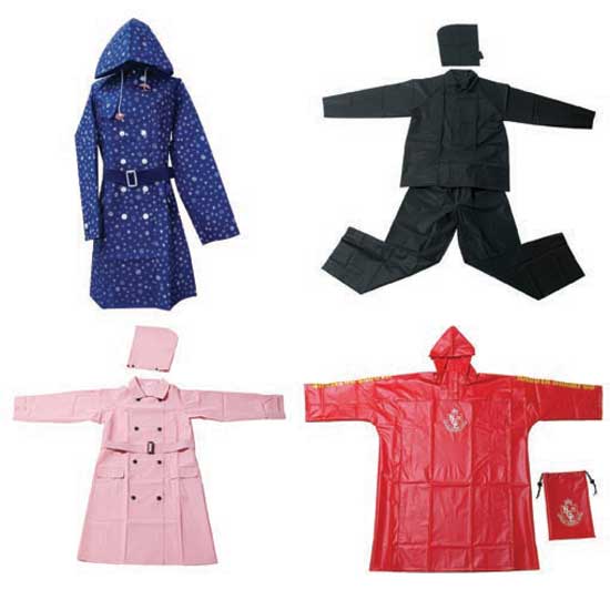 Pictured are 4 fashionable raincoats in different designs for adults or kids. The raincoat is made of safe and eco-friendly materials. They are perfect alternatives to umbrellas on cold and rainy days.