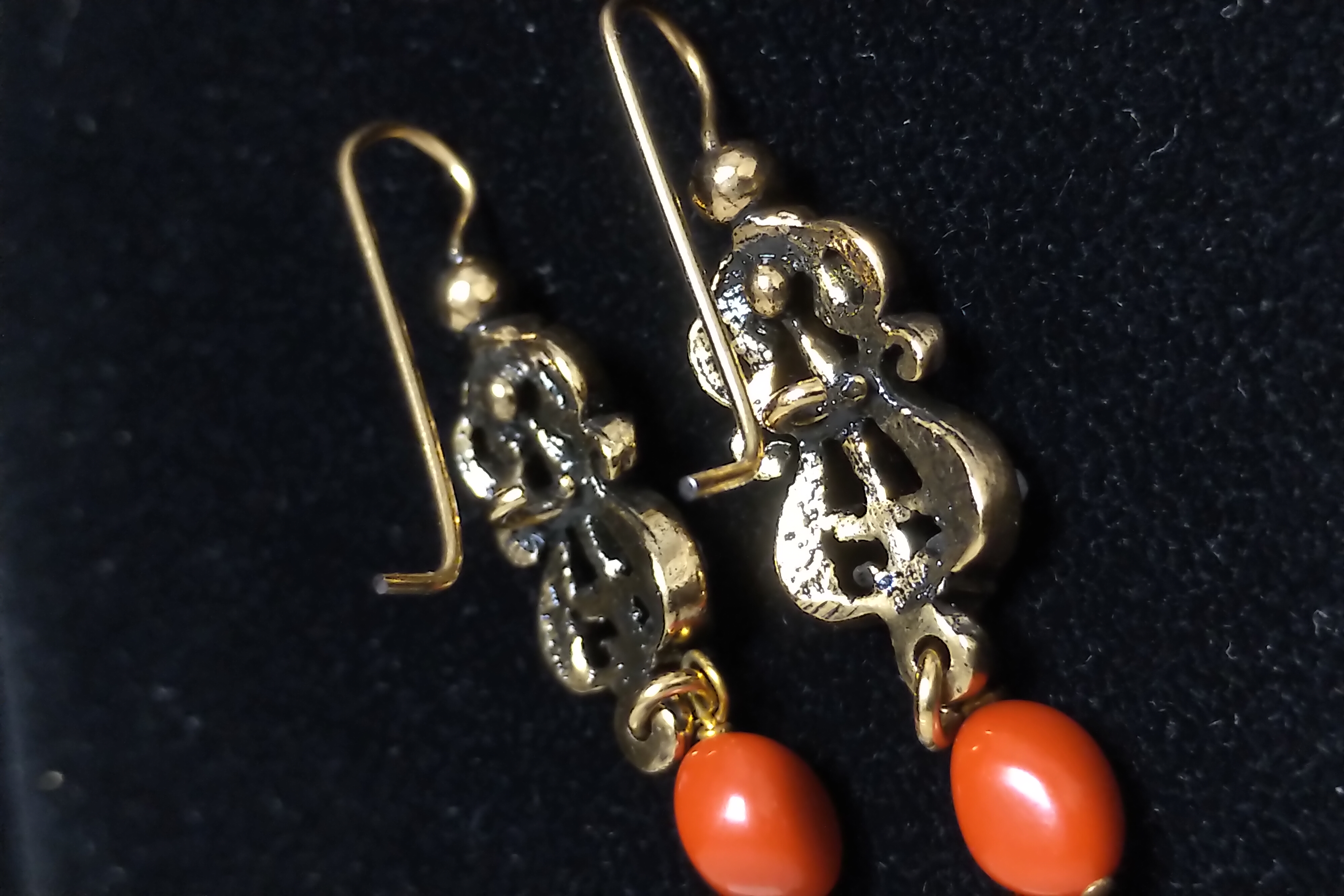 Golden Brass Earrings With Classic Decorations And Pearl And Coral Paste Element
