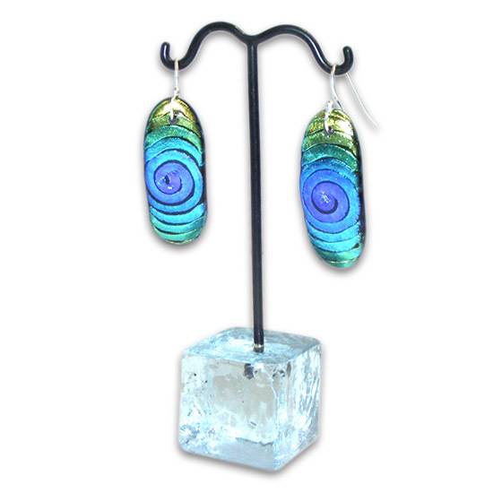 This pair of earrings presents a fascinating image. On each piece, a spiral pattern is found, which, with some imagination, may remind one of a whirlpool, attracting people into it. The colour change is amazing as well, from purple in the middle, gradually changing to blue and green towards both ends.