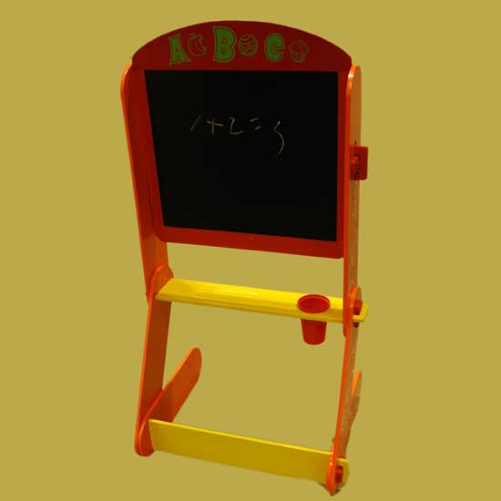 This is an easel board with a blackboard and whiteboard on both sides. It is equipped with a little cup to carry chalk and pen. Young kids are granted to enjoy hours of drawing fun on this easel board