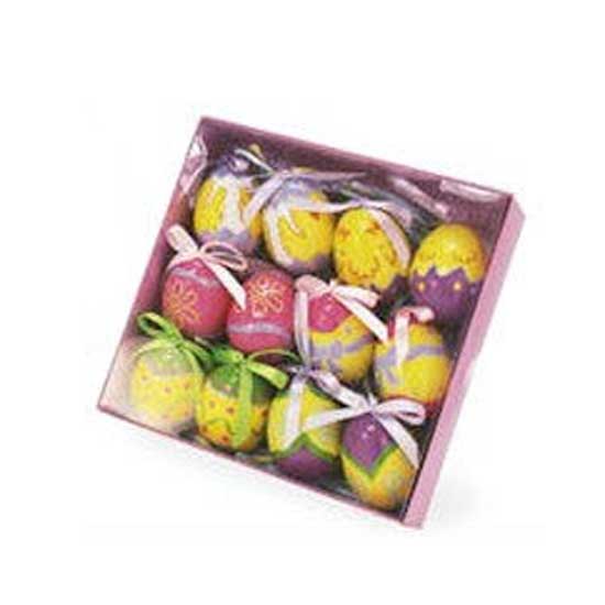 The Easter egg ornaments appeal to you with dynamic colors. Each egg is complemented by a nice ribbon. The eggs are neatly encased in a square box with a PVC lid.