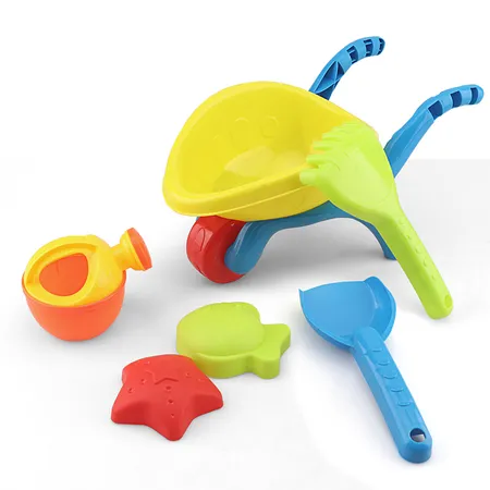 - Comes with watering can, rake, shovel, truck and two containers in the shape of a fish and starfish.
