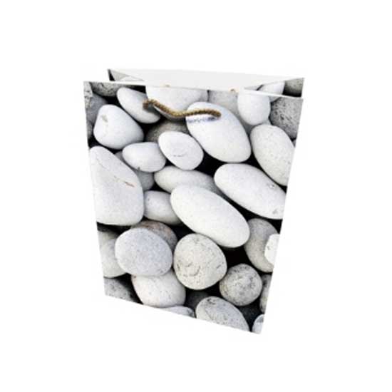 This is an eco-friendly paper bag that is printed with a picture of pebbles for added fanciness. The surface is laminated to promise lasting beauty. Print customized logos on this paper bag to optimize sales promotion.