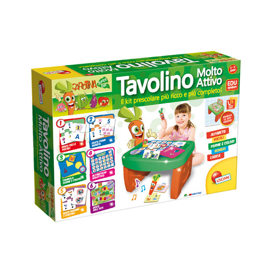 This strong, little, plastic table is easy to build and it contains several didactic activities. The content is specially oriented to develop logical thought and enhance abilities related to alphabet, colors, geometric forms and numbers. The carrot-shaped electronic pen can promote interaction with the games offered.