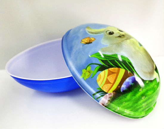 Cute and unique, this egg-shaped box makes a festive receptacle for Easter. It features an artistic cartoon rabbit, which is printed using the advanced thin plastic film printing and processing technology. The removable lid is manufactured with raised edges for easy lifting.