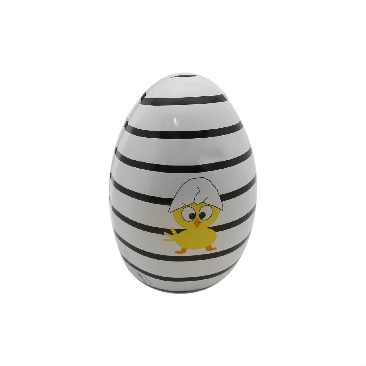 Bring a festive vibe to your home décor with this Easter egg tin. Rendered in refreshing white and navy stripes, this metal container is further accented with a lovable chick print for a delightful touch. It has a flat back and a spacious interior, which is ideal for storing candies.