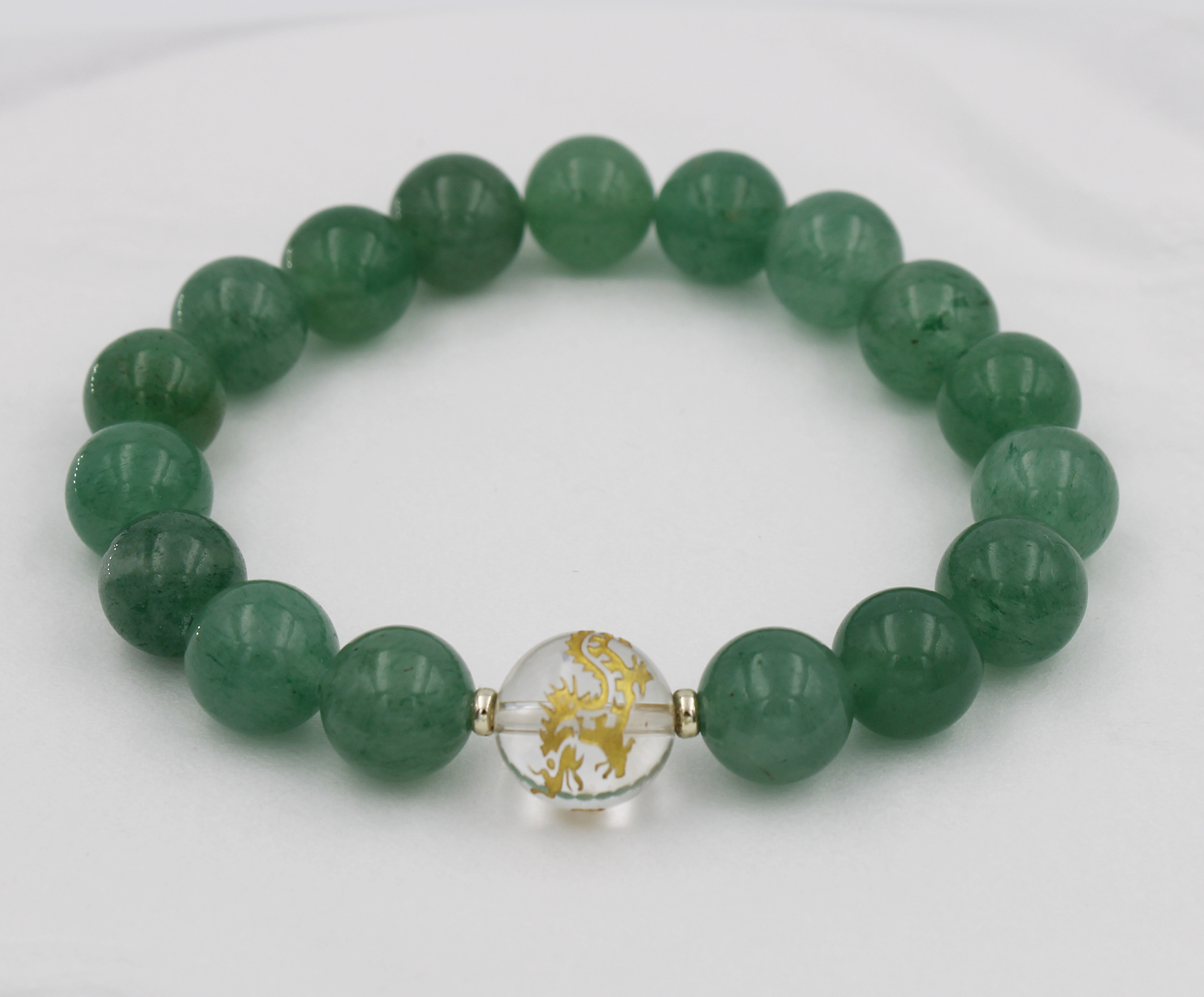 Consisting of 12mm crystal bead with dragon pattern (1pc.), 10mm aventurine bead (17pc.) & 3mm silver roundel (2pc.) in gold plated.