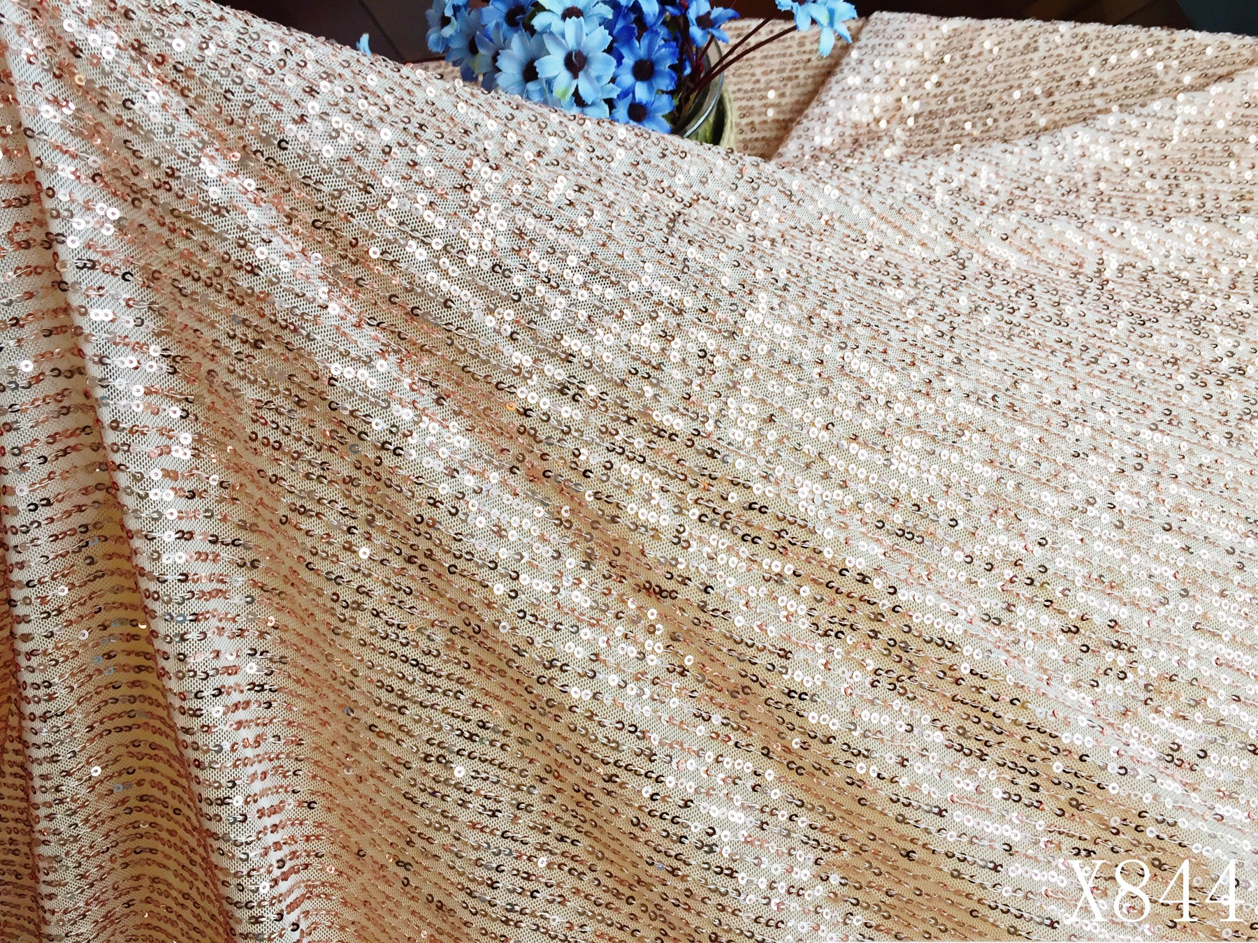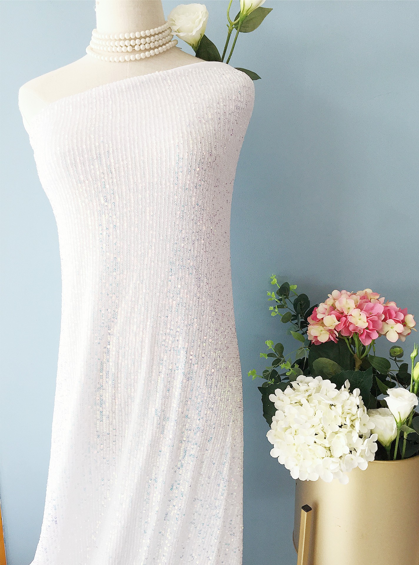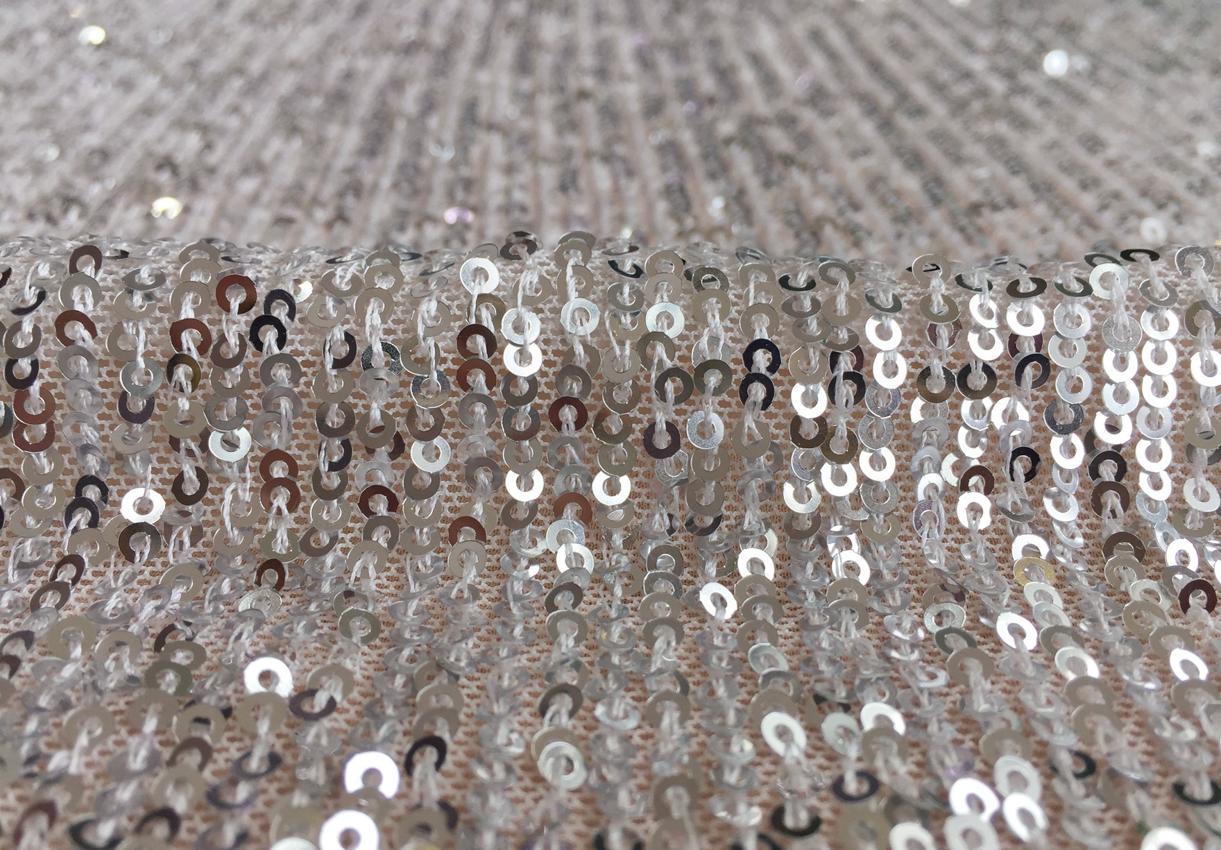 Four sides of elastic mesh embroidered vertical strip sequins.