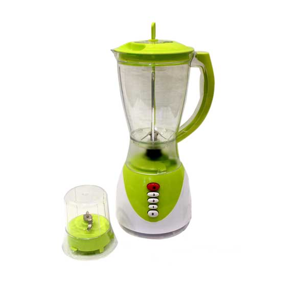 This electric blender in light green and white boasts a 1.5L transparent jar and a small blender jug. It features several speed levels, allowing great flexibility. It is designed with a lock button for enhanced safety.