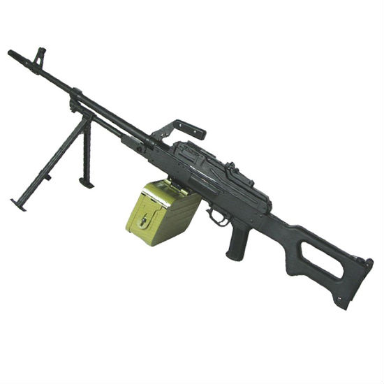 This air soft toy gun is a 1:1 replica of the PKM, a Russian machine gun. The high-capacity magazine is able to keep 4,000 rounds of BB bullets. The realistic air soft gun is made from steel