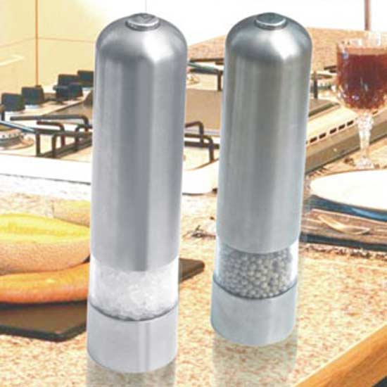 This pepper mill comes in a cool bullet shape for modern table setting. It possesses a stainless steel shell with a brushed finish. Simply press the button and the pepper or salt will be ready for use.