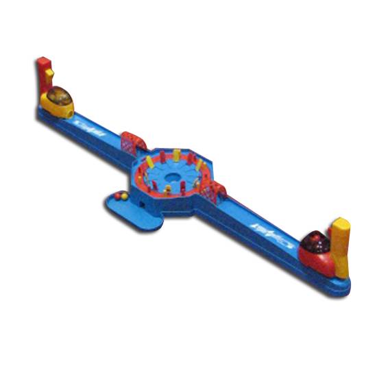 This electric game allows two children to compete with each other. There are rotatable obstacles in the middle. In order to win, players must shoot the coloured balls into the middle hole.
