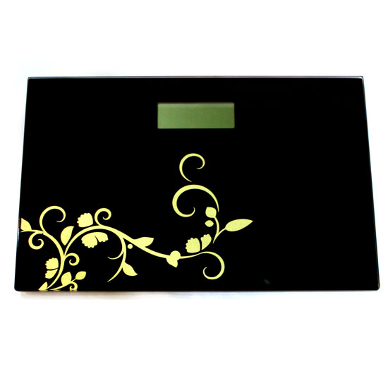 As shown is an electronic bathroom scale which runs with a lithium-ion battery. It will go off in 8 seconds automatically to save energy. Its ebony background is crafted with comely floral patterns.