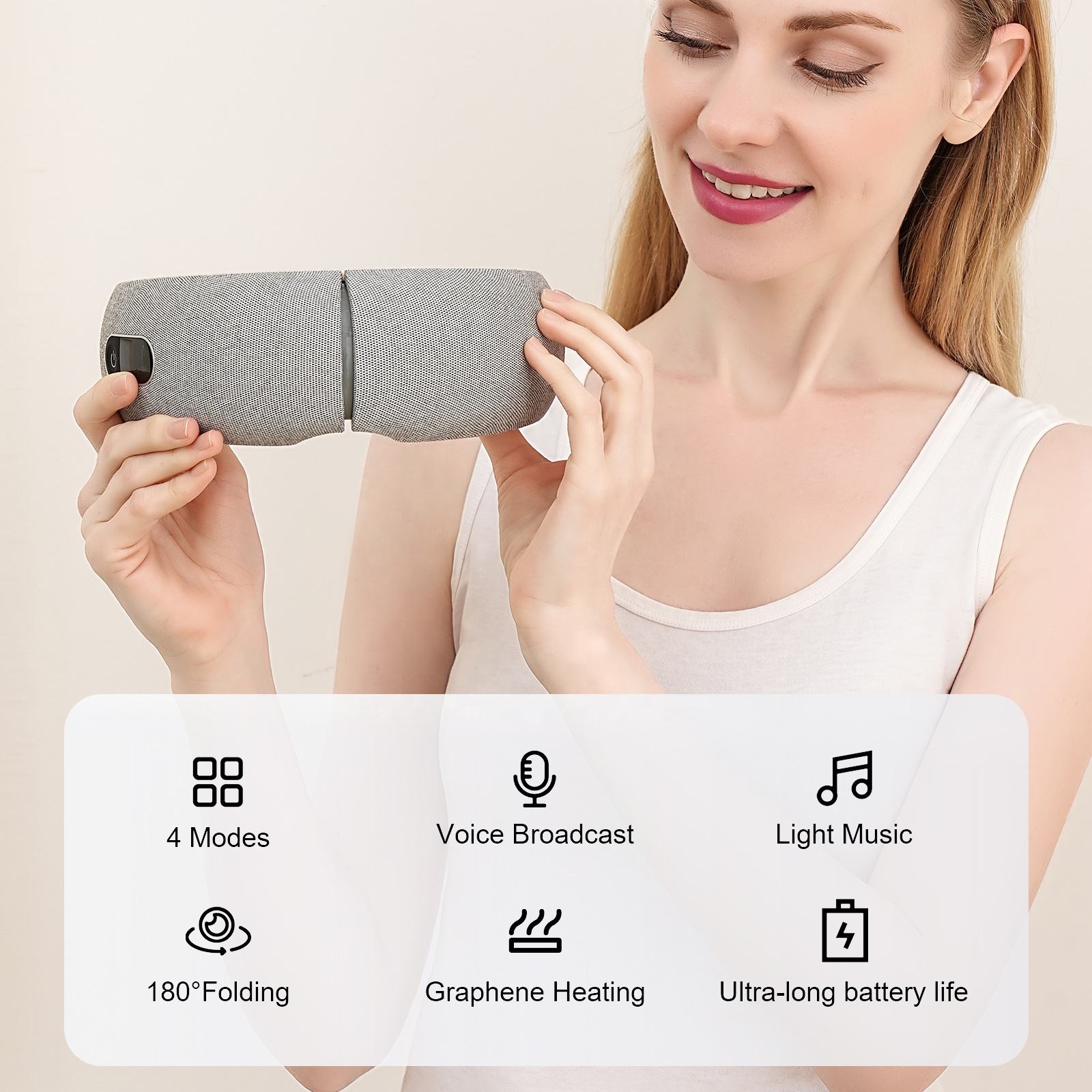 A compact eye massage device that uses gentle heat, vibration, and air pressure to help relieve eye strain, reduce fatigue, and improve relaxation anytime, anywhere.