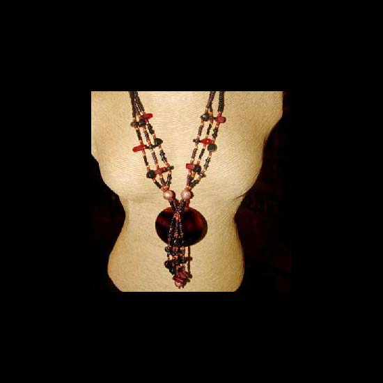 - The necklace is decorated by beads in harmonious colors of red, brown, pink and black