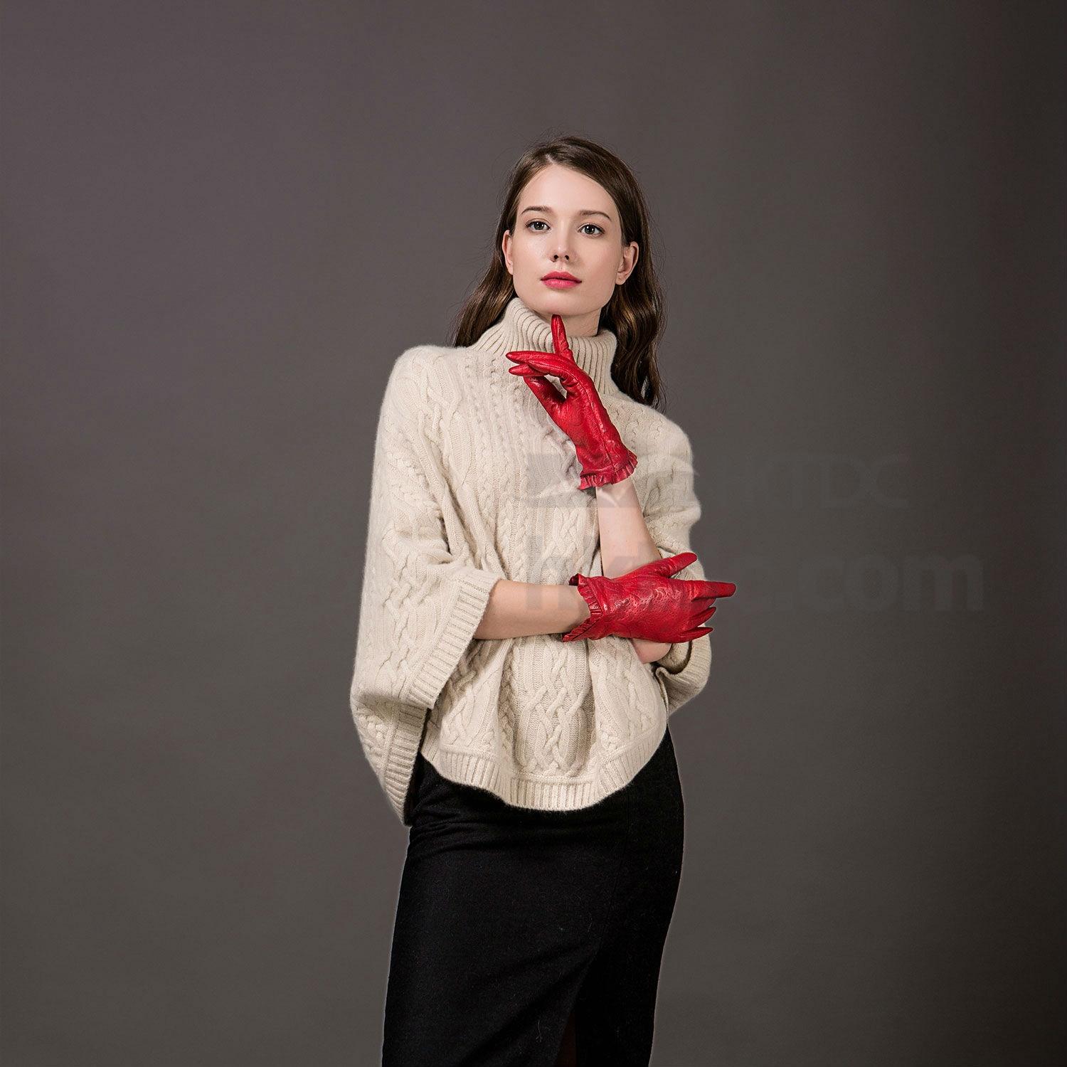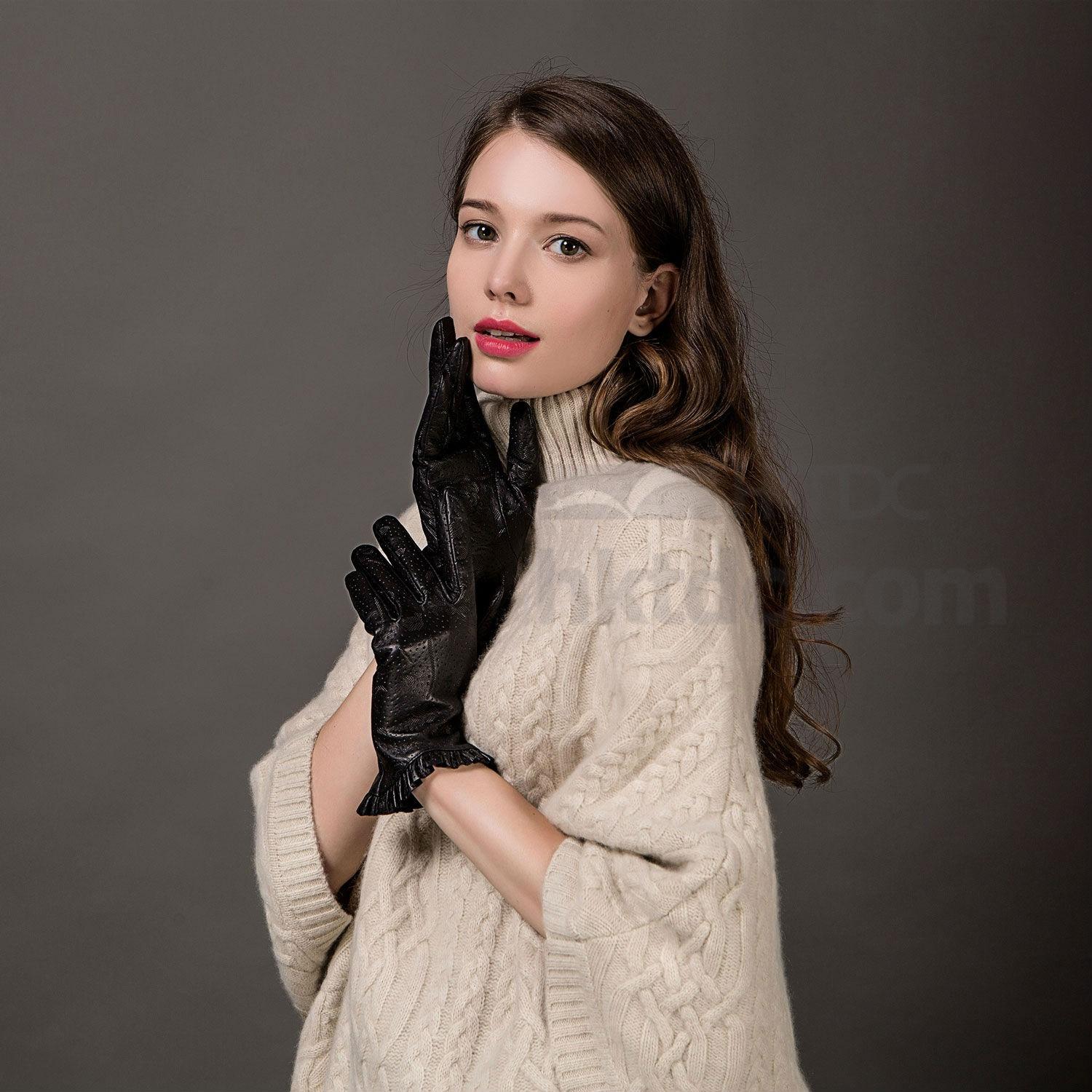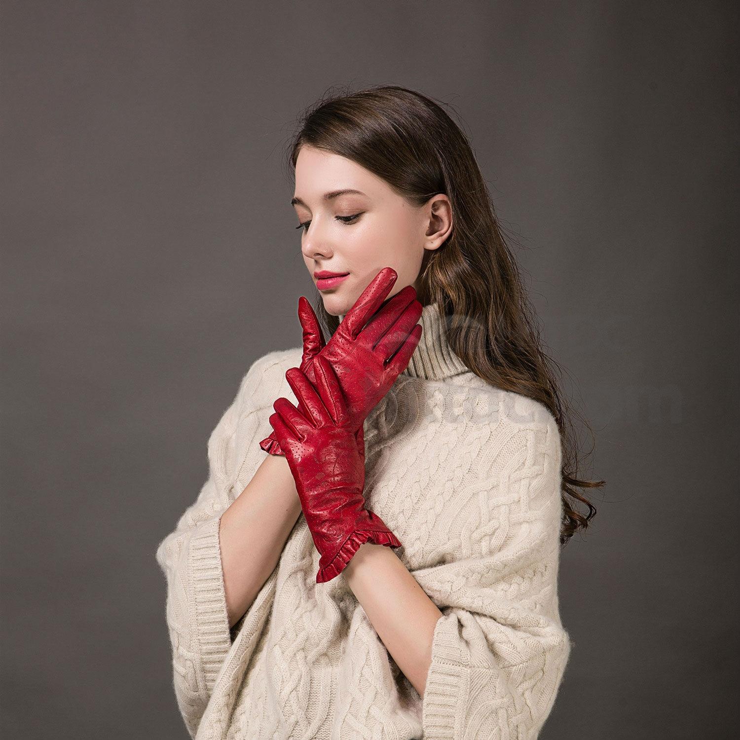 Keep your hands warm and stay stylish at once with these snuggly leather gloves. This fine glove features a textured dot pattern all over, and delicate embossed motifs decorate various parts of the gloves beautifully. Ruffled cuffs are made to elevate the gloves with a touch of femininity.