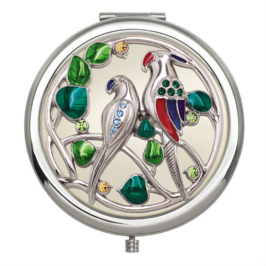 Round shape with exchangeable lid. Embossed parrots pattern with epoxy painted and color stones.