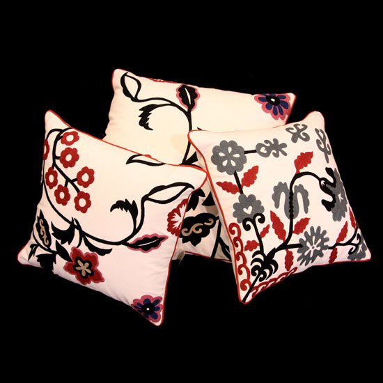 The appealing cushions feature white backgrounds highlighted by sharp red edges. Against the backgrounds are stunning embroidered floral patterns. These cushions wonderfully combine utility with perfect craftsmanship.