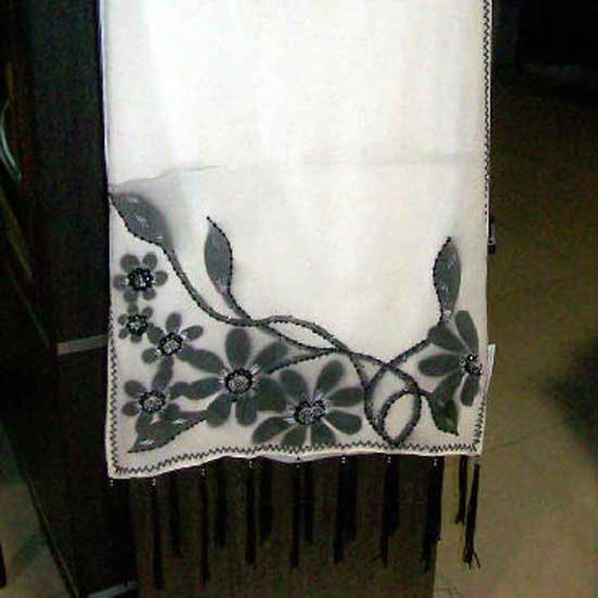 This embroidered scarf features a black floral pattern on a white fabric. The minimalist style of this scarf lends the wearer a touch of elegance. Black tassels add charm to this accessory.