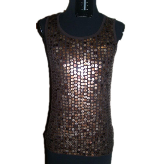 Showcased is a fashionable tank top coming with a scoop neck. The slim-cut top comes in brown for easy mix and match. The front is embroidered all over with metallic sequins to look chic and cool.