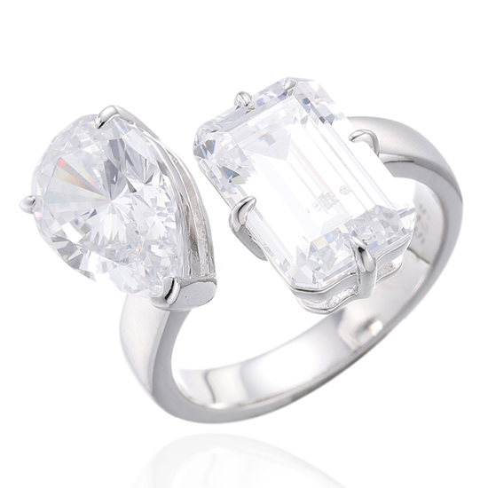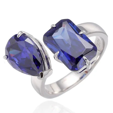 Emerald And Pear Shape Tanzanite Cubic Zircon Rhodium Silver Open Ring