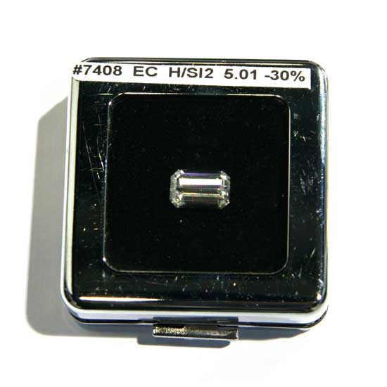 The fine-quality diamond, weighting 5.01 carats, has been certified for guaranteed grading. It is precisely cut to achieve maximum brilliance, fire and scintillation. This dazzling diamond makes a timeless gift for any lady.