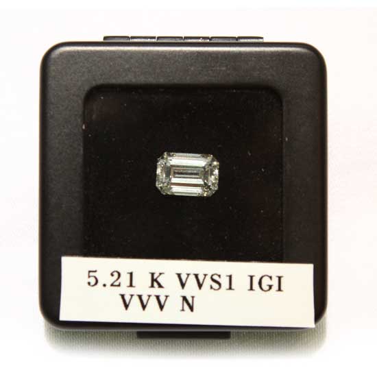 The emerald cut diamond in the K color measures 5.21ct for its weight. It flaunts a high-clarity body with plenty shining facets. This well-cut diamond makes a glamorous final touch to your jewelry creations.
