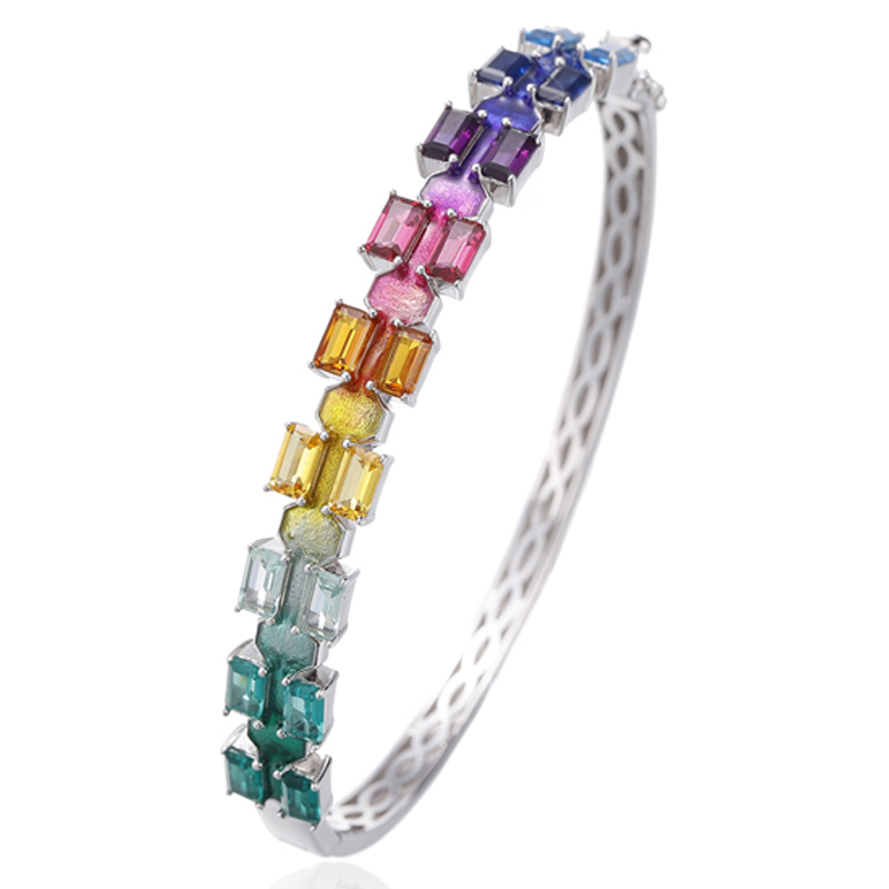 Emerald Cut Rainbow Cubic Zircon And Rainbow Enamel Rhodium Silver Bangle