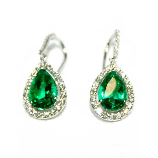 Showcased is a beautiful pair of pendent earrings set with precious emeralds. The green emeralds come in a faceted pear cut to give out enticing sparkles. The setting is set with diamonds to exhibit breathtaking beauty.