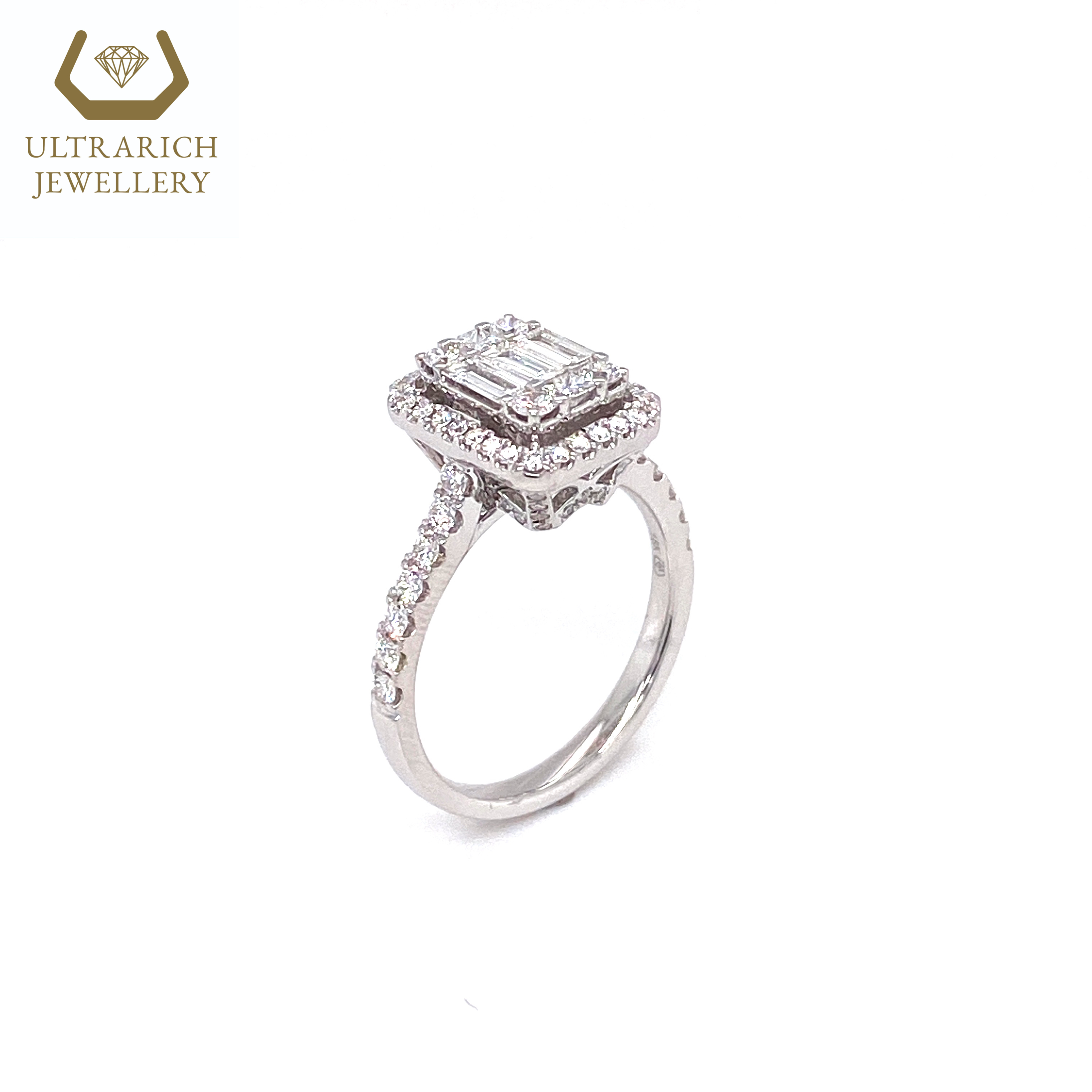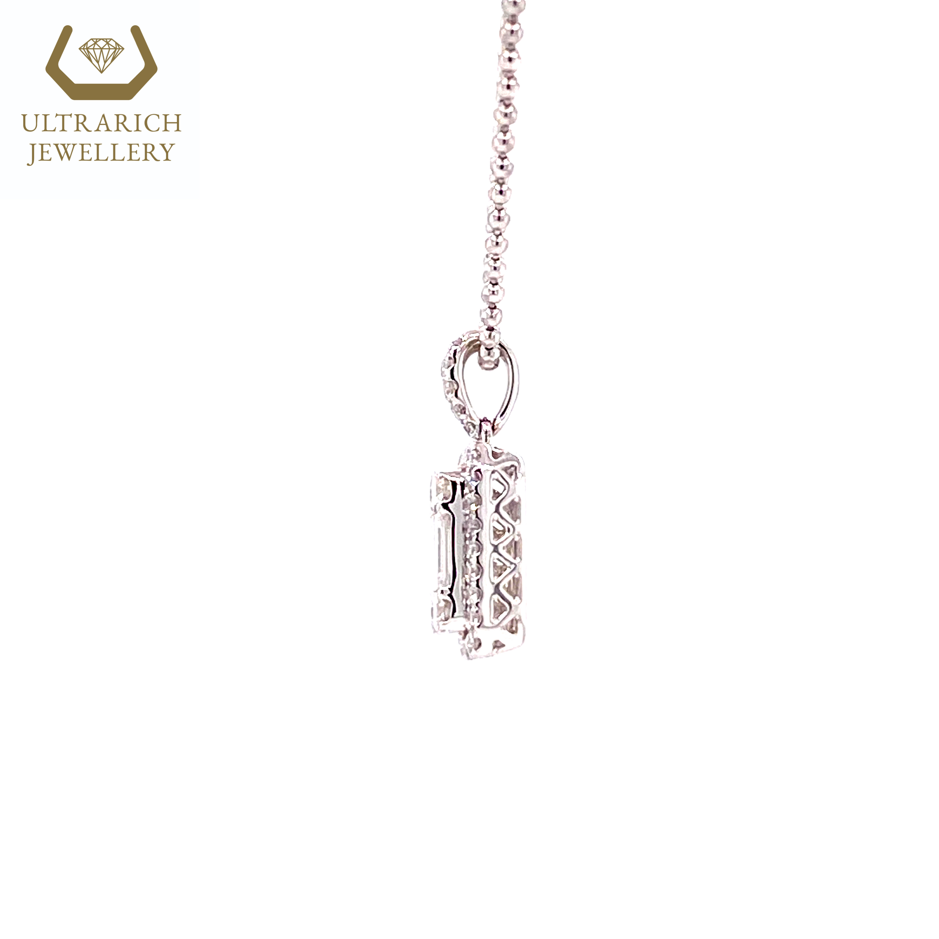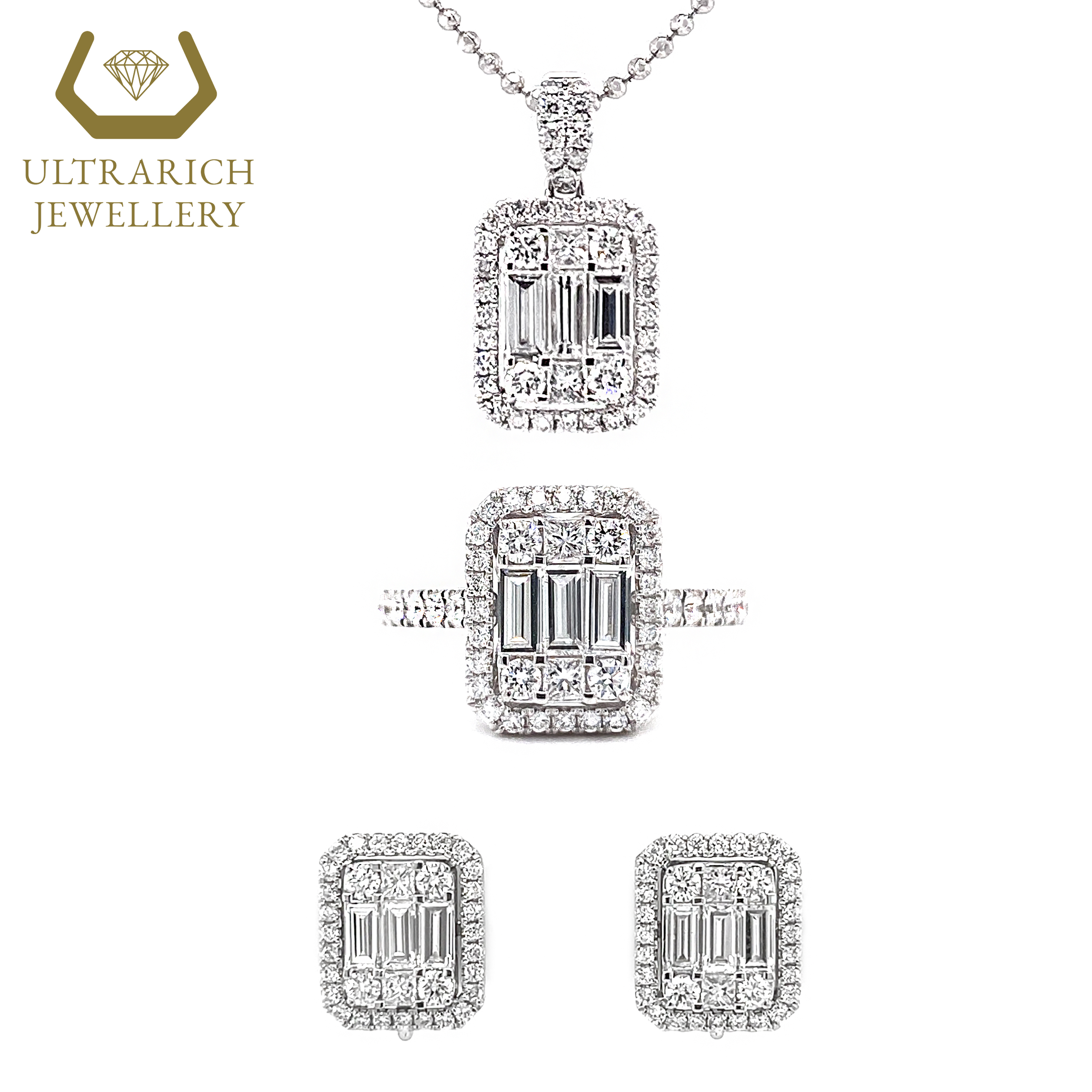 Emerald Cut Illusion Ring, Earring, and Pendant Set Made With All Natural FG VVS VS Diamonds Set In 18K White Gold