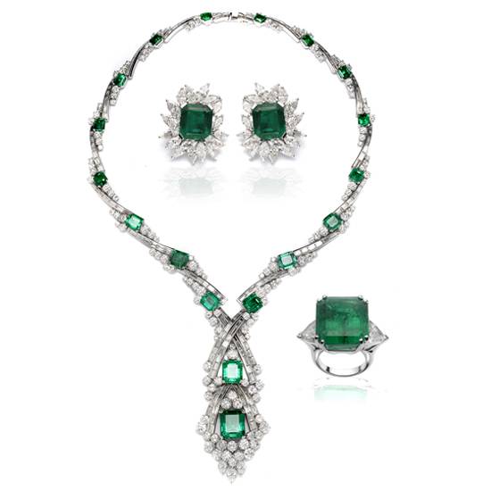 An emerald jewellery set with high quality emeralds of Columbian origin. This jewellery set includes a necklace, earrings and a ring. Magnificent jewellery set for ladies on formal occasions.