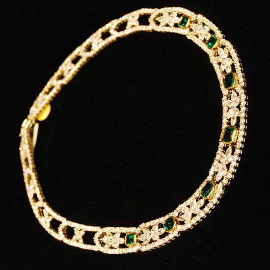 The dazzling 18K gold necklace is accented with diamonds all over. It features several square emerald stones in the center for added elegance. Complete your evening look with this gorgeous necklace.