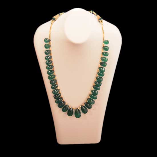 This single-strand long necklace is crafted from drop-shaped emerald stones. The high-grade emerald stones exhibit a vivid green color with high clarity. The stunning emerald necklace comes with a golden-toned chain.