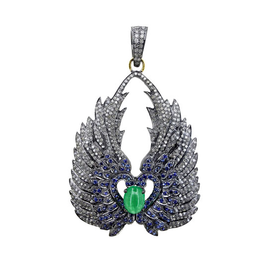 This is a refined pendant that comes with a fashionable ethnic appearance. The large green emerald gemstone highlights this jewelry. The allover dazzling white stones are well mounted on the micro settings.
