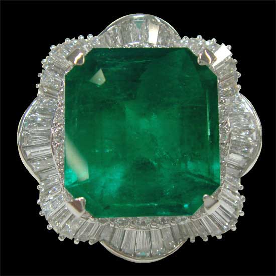 This ravishingly beautiful ring features a 22.78ct emerald set in the platinum 900 band. It is complemented with 4.52ct diamond setting for a sparkling and glamorous look. This magnificent emerald ring is a fabulous addition for fine jewelry collectors.