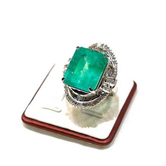 This is a finger ring with a unique and charming design. It is meticulously paved with various sparkling white diamonds and a green emerald centerpiece. This stunning ring surely is a great item for adding some glamor to your slender finger.
