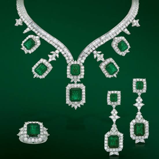 This is an emerald and diamond jewellery set of a necklace, a pair of earrings and a ring. The Y-drop necklace has six step-cut emeralds with small white diamonds in different sizes and shapes. The ring has a big step-cut emerald surrounded by small round white diamonds whereas there are four step-cut emeralds in two different sizes for the earrings.