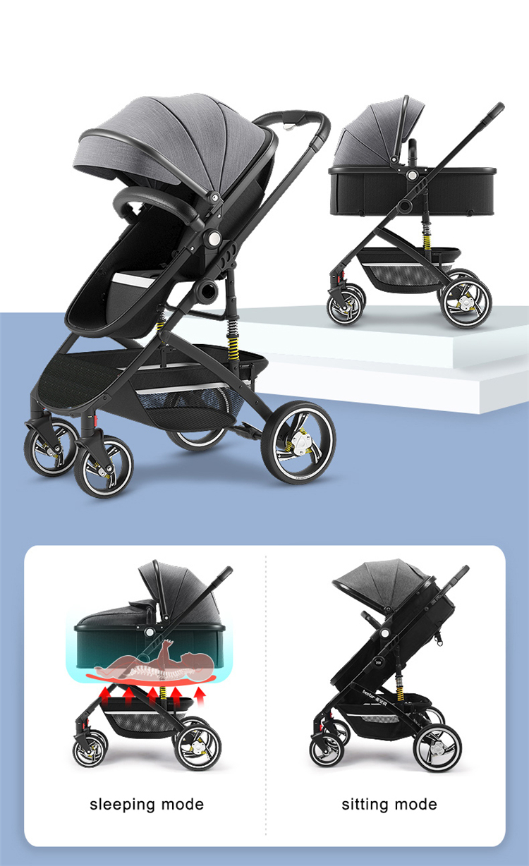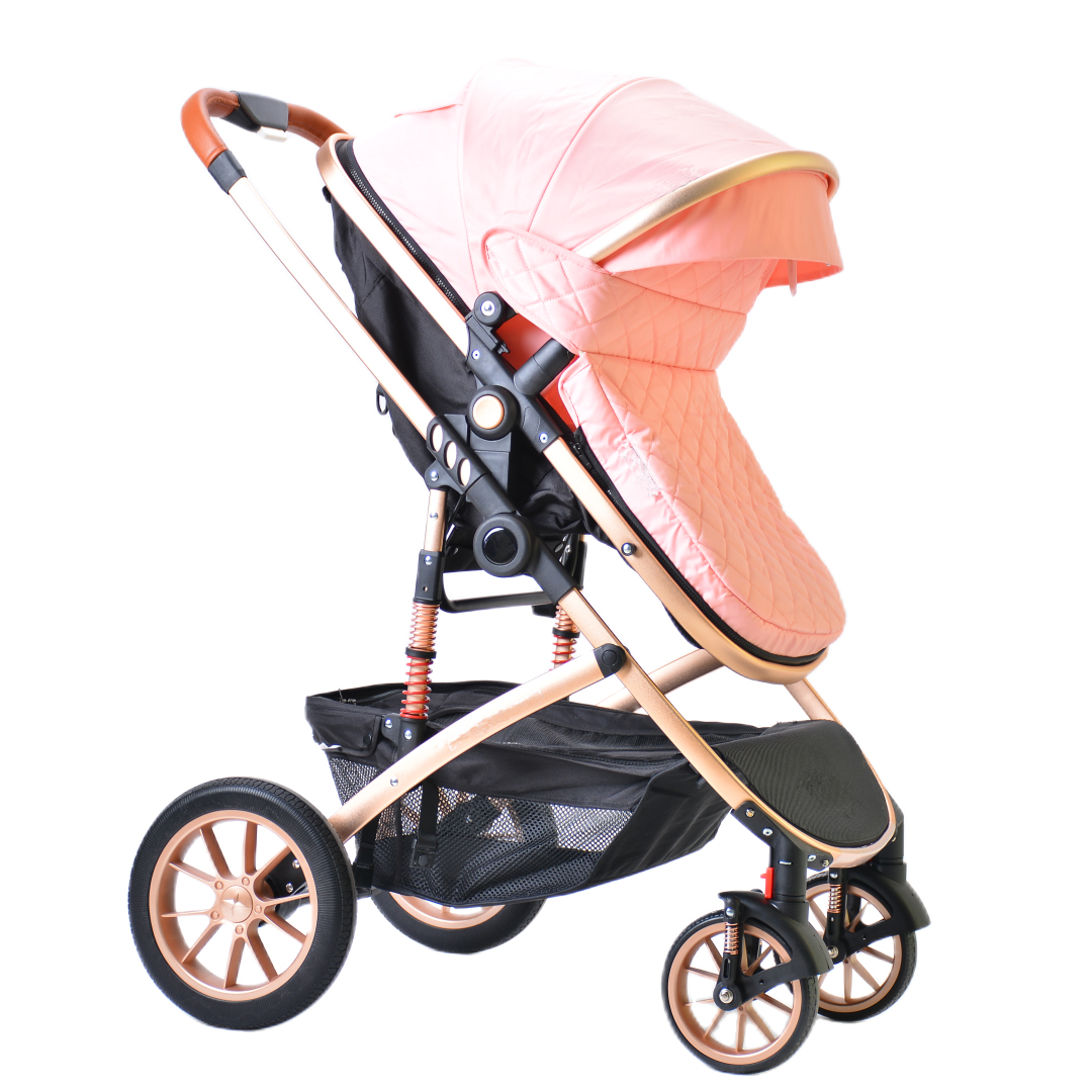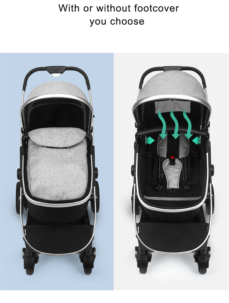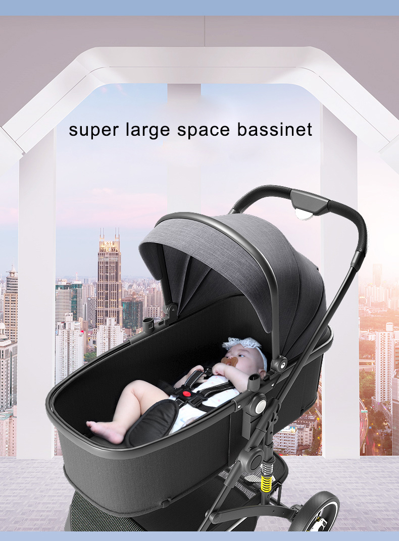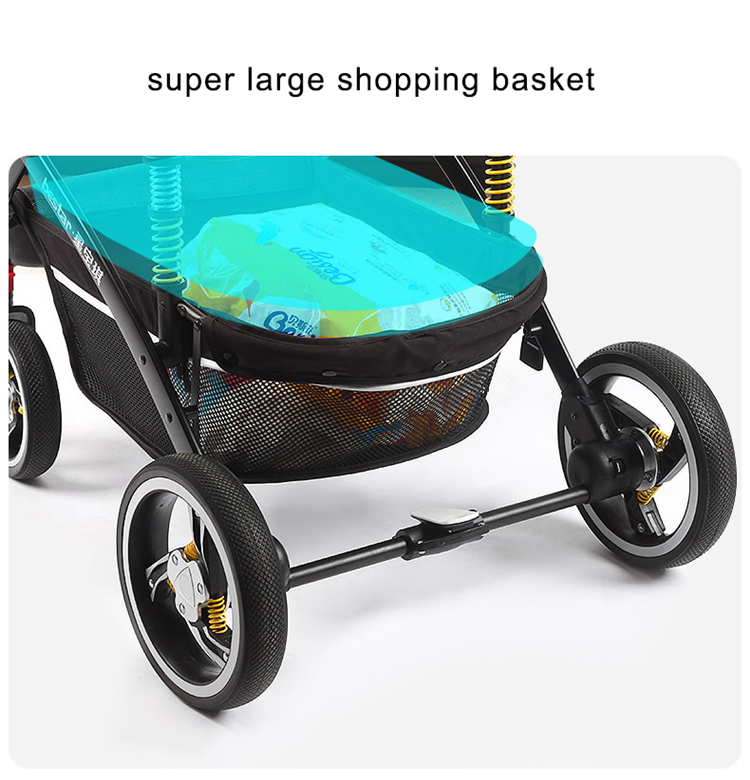 Features: One hand folding, frame with shock absorption, brake pipe with shock absorption, convertible bassinet, adjustable PU handle, cloth handle bar, PU footrest, quilting foot cover, cup holder, wrist safety belt, mosquito net,cotton cushion
