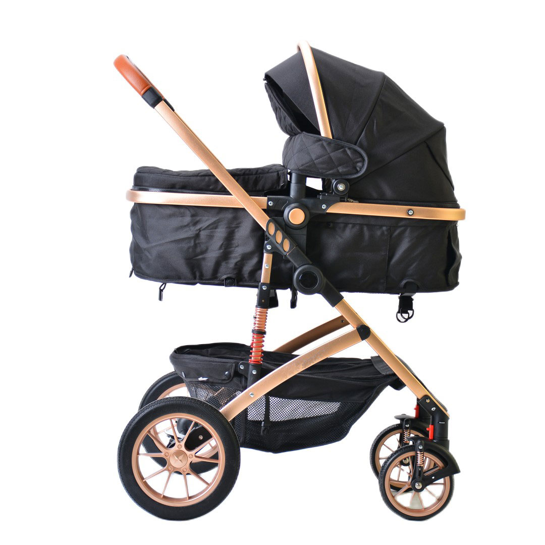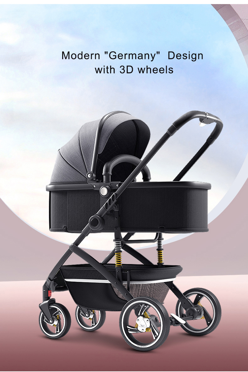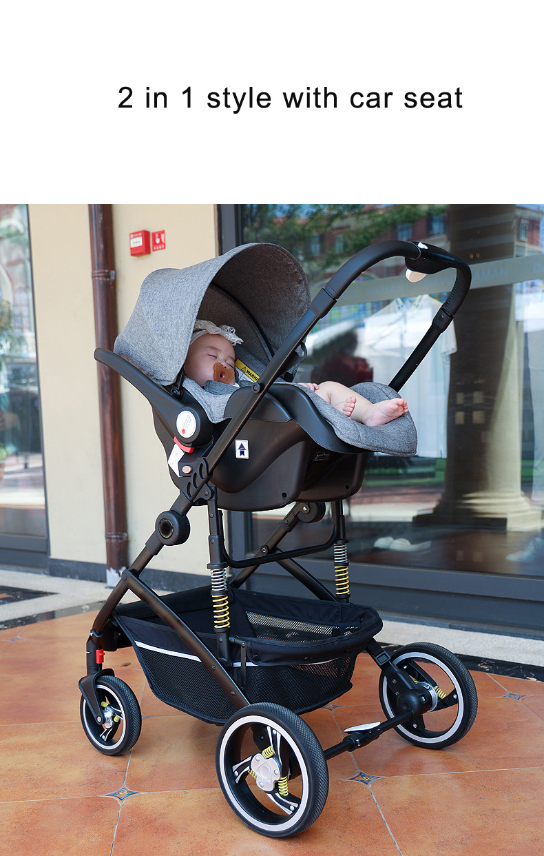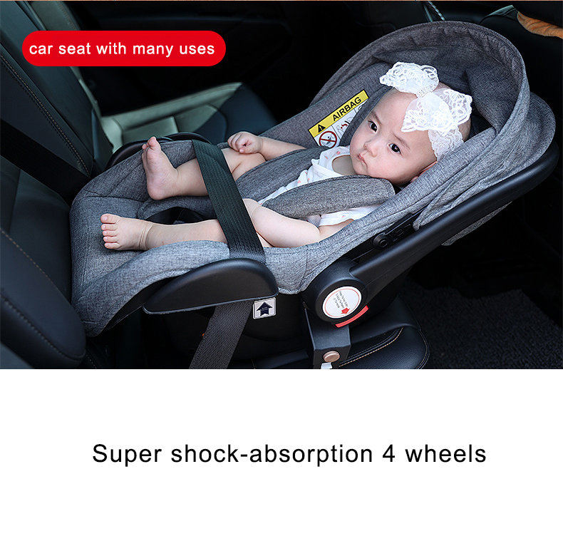 Features: One hand folding, frame with shock absorption, brake pipe with shock absorption, convertible bassinet, adjustable PU handle, cloth handle bar, PU footrest, quilting foot cover, cup holder, wrist safety belt, mosquito net,cotton cushion