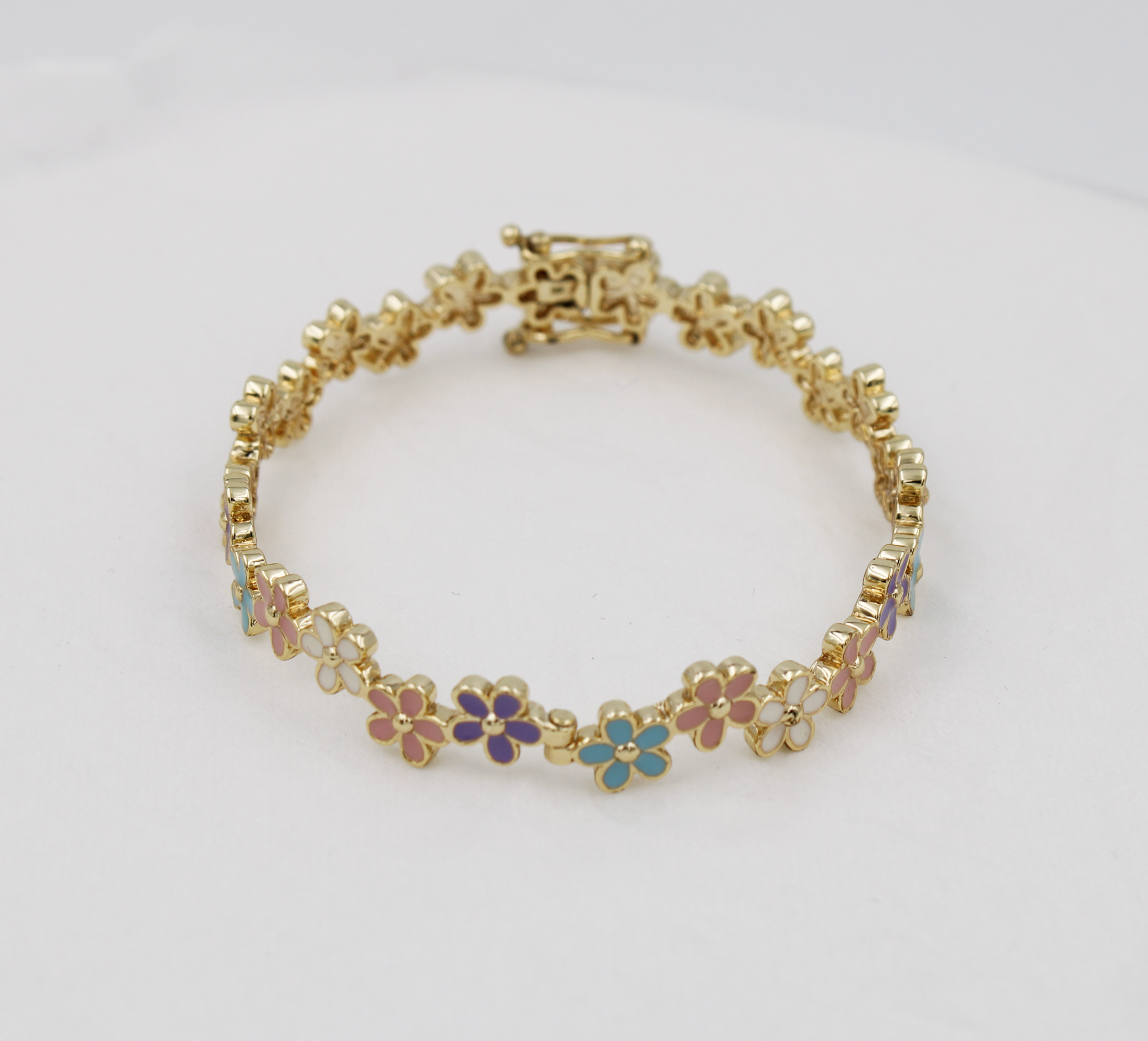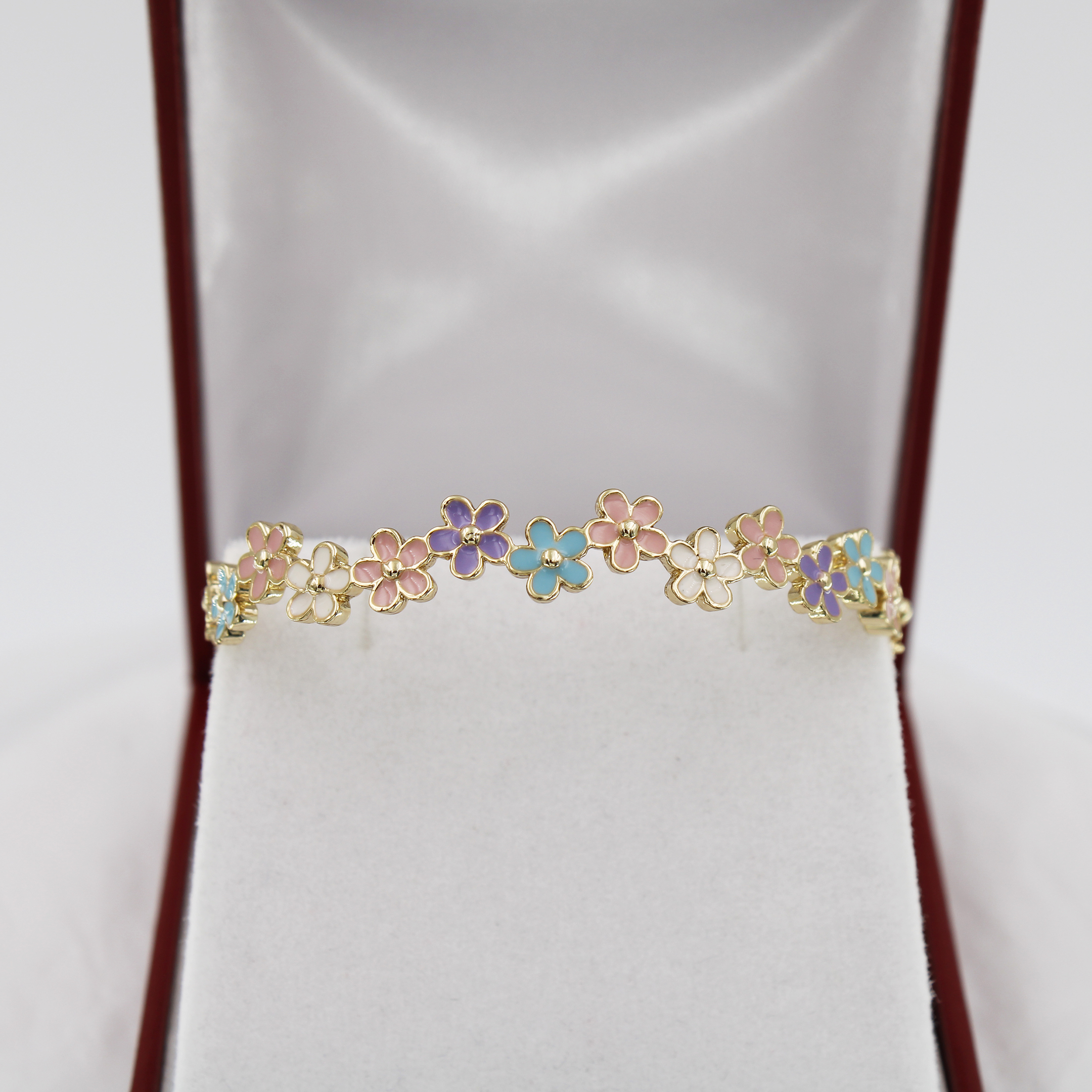 50mm brass bangle, flower shape pattern with multi-layer enamel. white, pink, blue and lavender All brass material are 0.01-0.02 micron of 18K gold color plated + e-coating, free of nickel.
