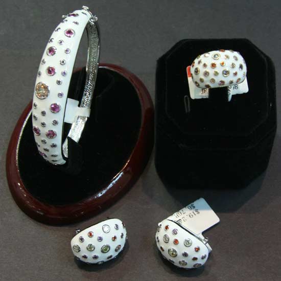 The jewelry set flaunts CZ stones in vibrant colors. It includes a bangle, a finger ring and a pair of earrings. The enamel stones make it stand above the rest.