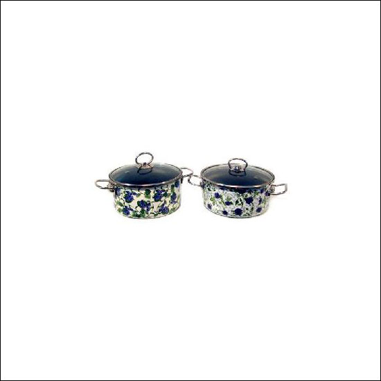 Enamelamine stockpots is with floral pattern on teh exterior and black inside with handle
