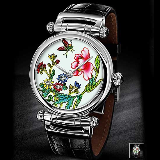 This men's enamel watch is inspired by traditional Chinese paintings of flowers and butterflies. The stainless steel watch case and leather watchband complement the design in a sophisticated manner. This finely crafted timepiece is water-resistant to ensure long durability.