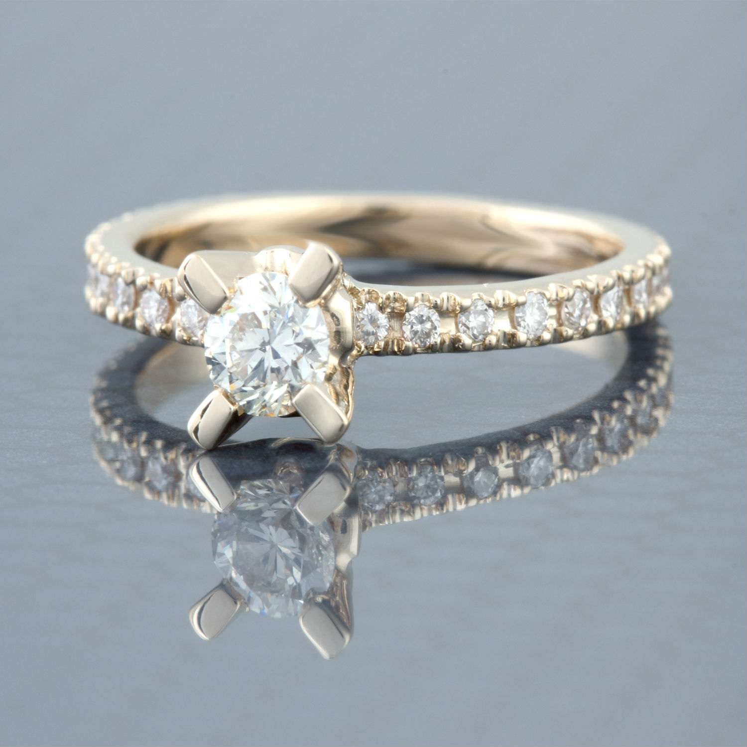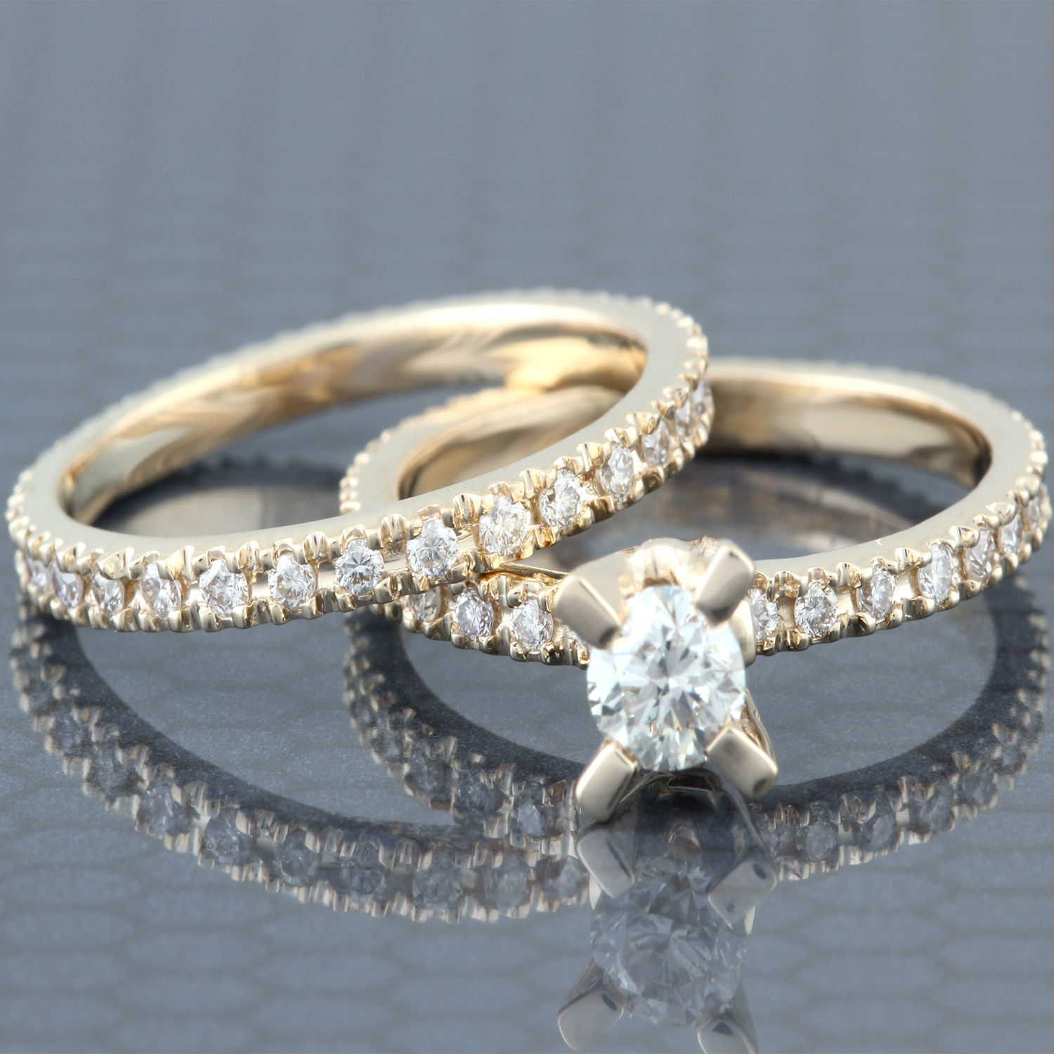 This band 14K Yellow gold set is comprised of 0.64Ct and 0.35Ct Center stone round white diamonds.