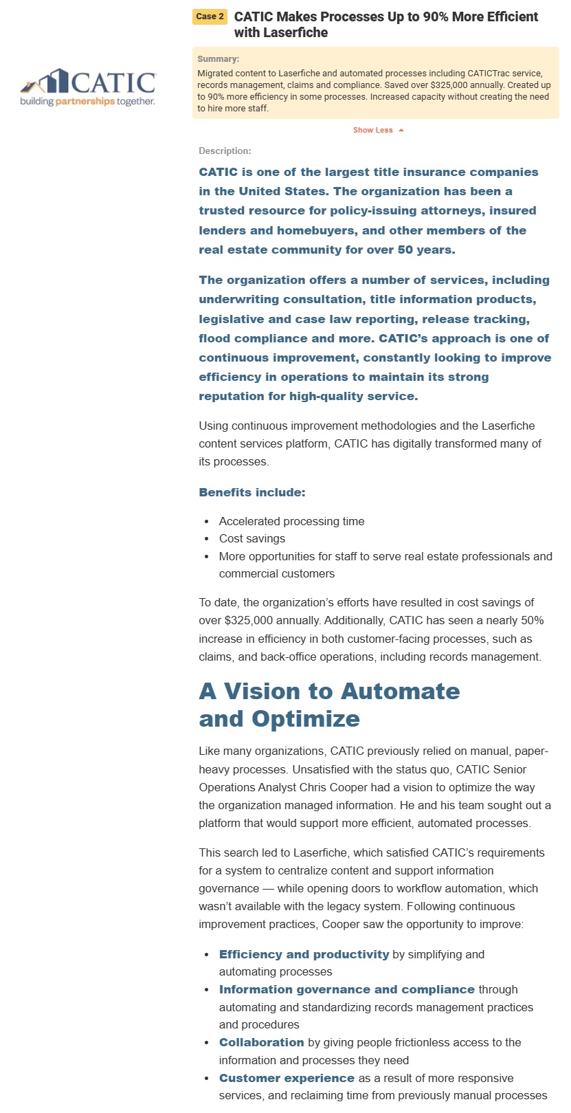 Laserfiche helps insurers, agents and brokers digitize and automate the management of policyholder documents, claims and policies. Connect data and workflows across core systems to speed up response times, reduce compliance risks, and allow staff to focus on growth and customer service.