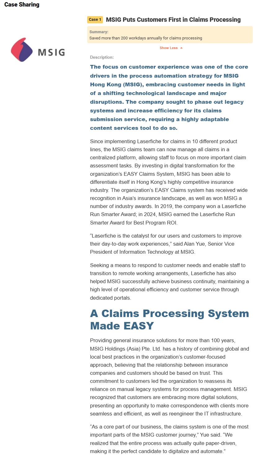 In Asia’s fast-changing insurance markets, where digital-first customers demand instant service and regulatory requirements are increasingly complex, insurers must modernize to stay competitive. Laserfiche provides cloud-based enterprise content management (ECM) and process automation that enables insurers to digitize policyholder data, accelerate claims and policy workflows, and strengthen compliance — empowering teams to deliver efficient service and build customer trust.