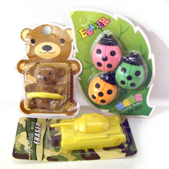 These are eraser sets which contain colourfully made erasers made into animal shaped or tanker shaped. The eraser can be act as stationery and toy at the same time.