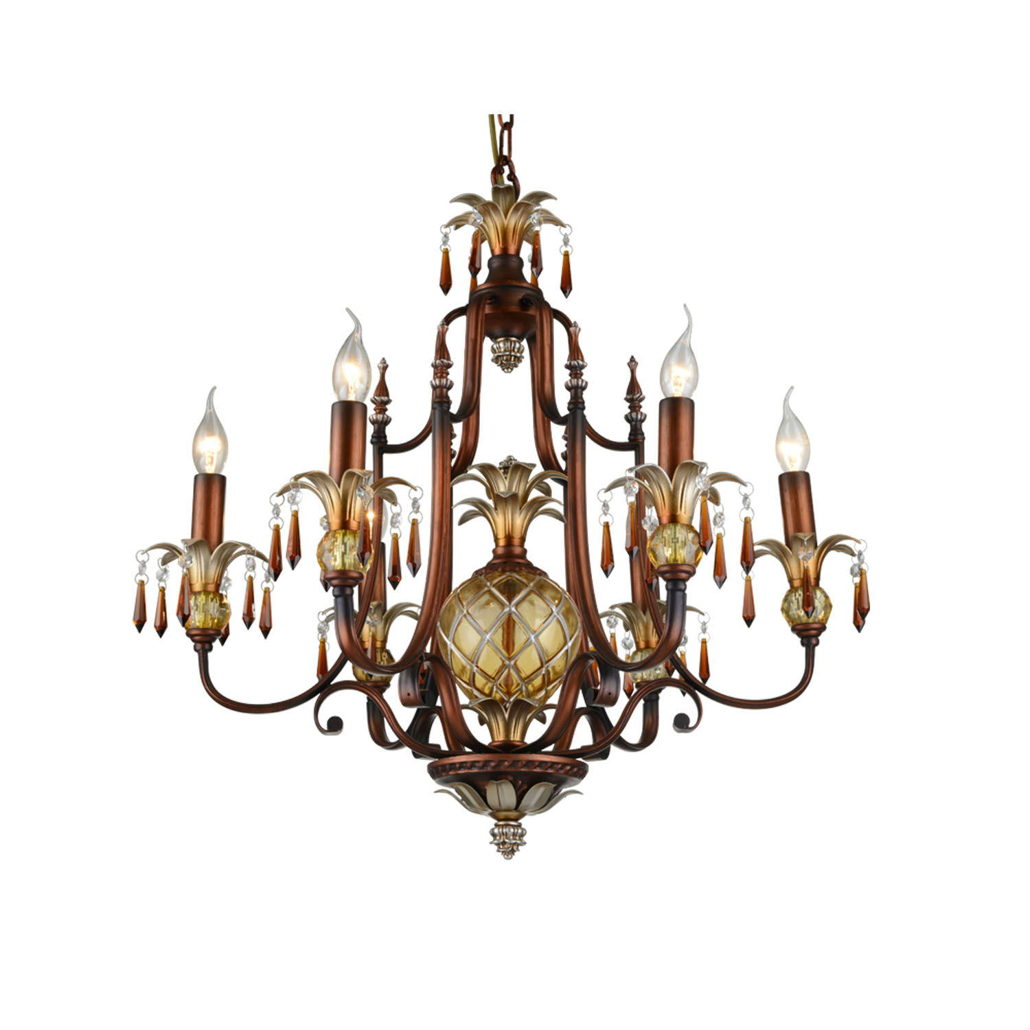 This chandelier captures a gracious theme of hospitality. In this amazing chandelier, a dazzling pineapple is surrounded by six candle lights mounted in pineapple-shaped shades. Adorned with sparkling crystal pendants in monotone, stunning details is added to the design. This is a charming one to add in your home décor for an inviting and cozy ambiance.
