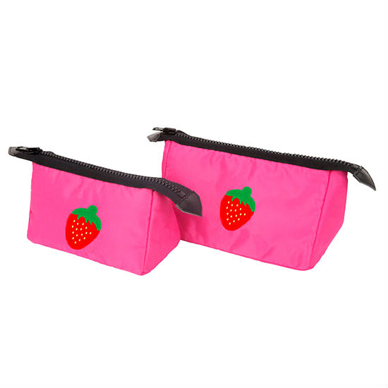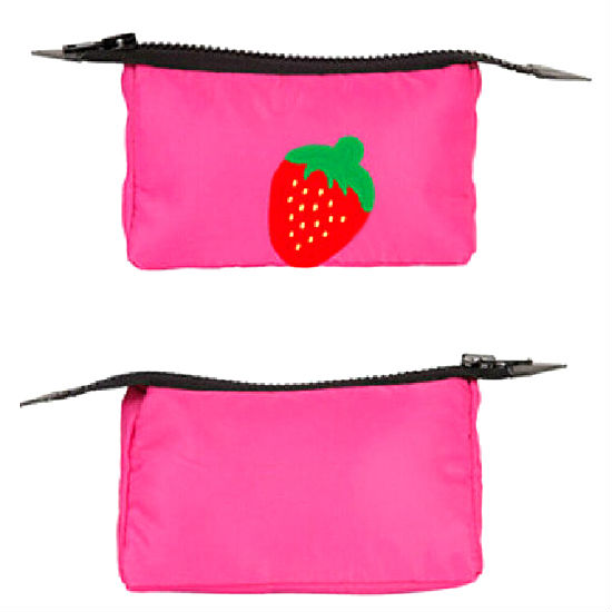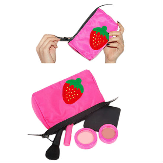 European popular cosmetic bag displayed is made of nylon with printing strawberry logo