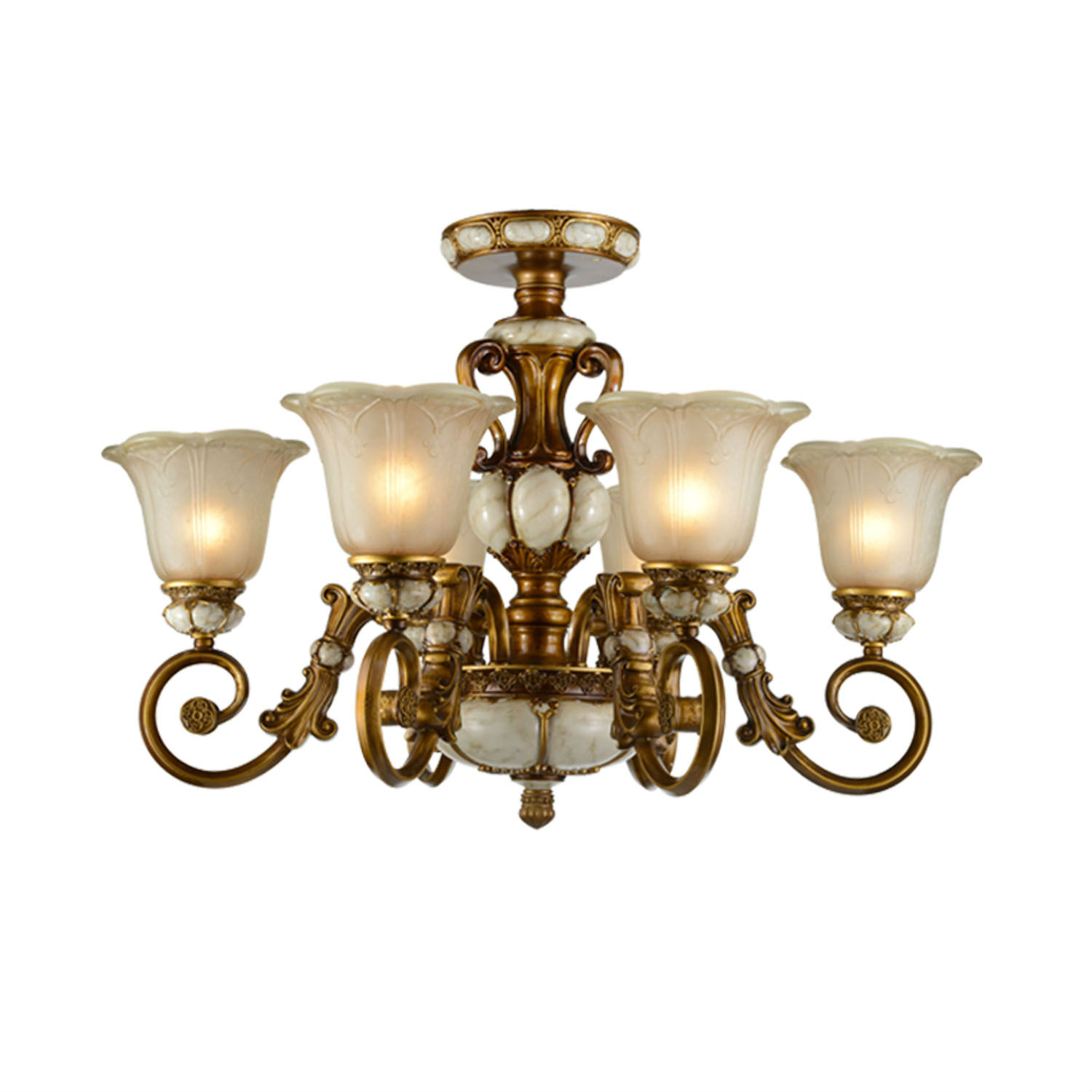 This Chandelier contains six lights in creamy glass shades. The curling arms and scrolled flourishes create a striking silhouette. Extravagance is boosted by perfectly matching the marble pattern with the bronze finished rod. Sparkle up your evening with this antique chandelier.